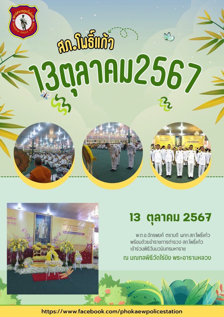 วันที่ 13 ตุลาคม 2567 พ.ต.อ.จักรพงศ์ ตราบดี ผกก.สภ.เขาดิน รรท.ผกก.สภ.โพธิ์แก้ว พร้อมข้าราชการตำรวจ สภ.โพธิ์แก้ว เข้าร่วมพิธีวันนวมินทรมหาราชา ณ มณฑลพิธีวัดไร่ขิง พระอารามหลวง อ.สามพราน จ.นครปฐม