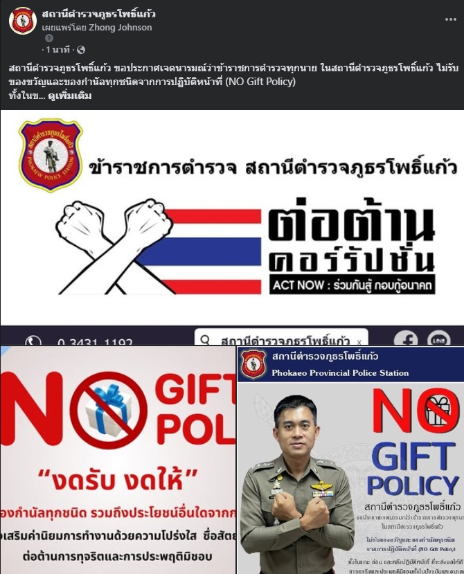 วันที่ 3 มีนาคม 2568 เวลา 14.00 น. ผู้กำกับการสถานีตำรวจภูธรโพธิ์แก้ว พร้อมข้าราชการตำรวจสถานีตำรวจภูธรโพธิ์แก้ว ประชุมชี้แจงประกาศเจตนารมณ์ที่จะไม่รับของขวัญและของกำนัลทุกชนิดจากการปฏิบัติหน้าที่ (No Gift Policy) ร่วมกันสร้างวัฒนธรรมองค์กรและค่านิยมสุจริตในการปฏิบัติงาน ไม่ยอมรับระบบ อุปถัมภ์ หลีกเลี่ยงการกระทำ อันอาจมีผลต่อดุลยพินิจหรือการตัดสินใจในการปฏิบัติหน้าที่ซึ่งนำไปสู่การเลือกปฏิบัติ ป้องกันการปฏิบัติหน้าที่อย่างไม่เป็นธรรม และไม่ให้เกิดผลประโยชน์ทับซ้อน พร้อมทั้งสร้างความเชื่อมั่นต่อประชาชนในการปฏิบัติหน้าที่อย่างมีธรรมาภิบาล พร้อมได้ประชาสัมพันธ์ ผ่านช่องทาง Facebook ของสถานีตำรวจภูธรโพธิ์แก้ว ด้วย