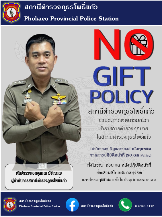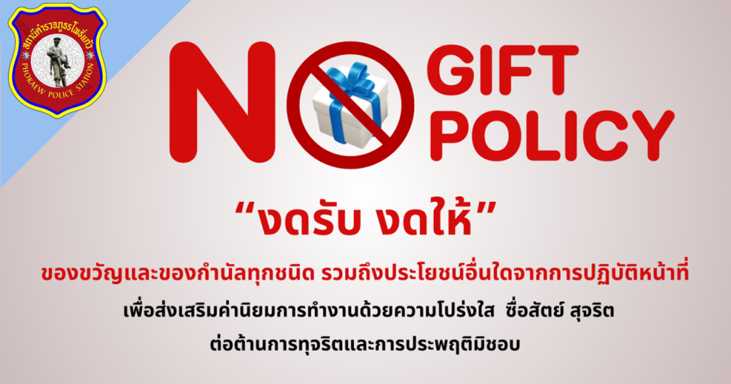 - ประกาศสำนักงานยุทธศาสตร์ตำรวจเรื่องเจตนารมณ์ที่จะไม่รับของขวัญหรือของกำนัลทุกชนิดจากการปฏิบัติหน้าที่